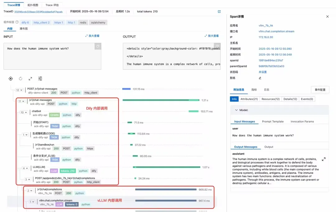 调用量分析视图,能够看到 input/output 的情况,Dify 中 workflow 的每一步执行情况,这里的每一步都对应了 Dify 中的一个流程,以及 vLLM 内部的推理执行情况。