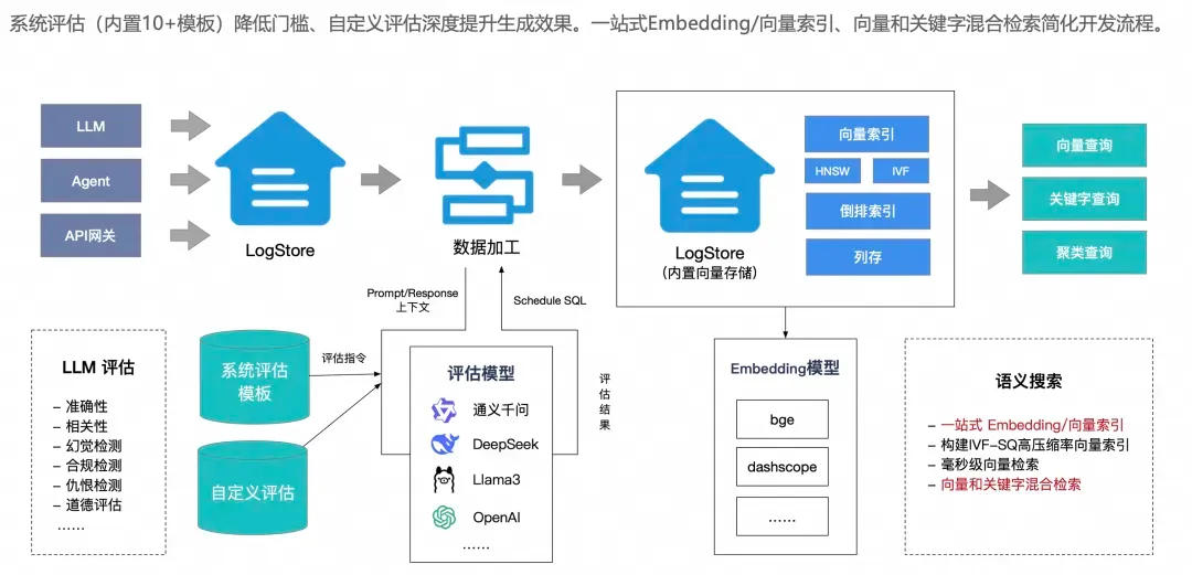 然后接下来讨论一下这个模型的质量的问题,我们想要解决模型回答得好不好,每次模型的升级和优化,我们都需要建立一个基线,并且确保模型的迭代满足这个基线,否则回答的质量会导致用户体验的受损。为此,我们把模型的 input/output 全部都采集到阿里云的日志平台中,然后接下来我们可以拆选出一批记录,通过一些数据加工,引用外部的裁判员模型,对当前这个模型的回答的输入输出结果进行一个评估。