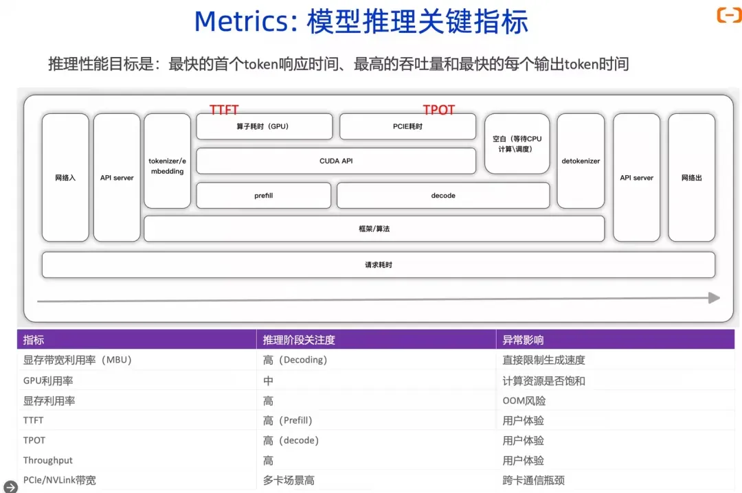 针对单个请求来说,最关注的就是这两个指标,一个 TTFT,一个 TPOT。然后还有一个指标比较重要的就是我们的吞吐率。吞吐率的话其实就是衡量我们这个模型本身,同时能够去支撑多少个推理请求。所以这几个指标它是有一些平衡在里面,也不可能就是这三个指标同时满足的特别好。比如说在线推理的场景下,我们会通常会关注更快的 TTFT 和 TPOT。但是在离线分析的时候,我们可能一批一批量会为给模型一批数据他去做分析。我们希望模型能够提供更好的吞吐率,而 TTFT 反而就没有那么关注了。这些关键指标,我们都会采集上报上来,并且重点展示出来。