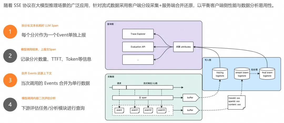 此外,针对流式上报的场景,我们也做了一些优化。在阿里云的内部很多业务也使用了这个数据采集的探针,当一些大流量的场景下,比如网关想要去采集这个流式的数据,模型的返回结果可能是比较大的,一次调用可能会有几千上万个 token 产生,流式场景下 token 是一批一批的返回的,如果要完整的采集输入输出,需要在网关中去缓存这些 token 数据,一直等到结束以后再把数据往上报,在高并发的情况下,这种方式会对我们的应用有一些内存占用造成一些压力,因此我们也做了一些优化方案,将数据进行拆分上报,把这些数据分批地上报到服务端,然后在服务端把这些内容再组合还原,起到降低内存占用的效果。
