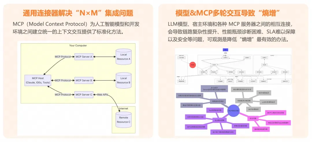 这个最核心的问题就是当我们构建了一个使用 MCP 工具的 AI Agent,当输入问了一个问题,模型最终给出了一个回答,这个回答可能能耗 1000 个 token。但实际上他背后可能掉了几十次模型,背后调用非常多的 MCP tools,实际消耗了可能有上万个 token。如果我们只看最终它的输出,很容易忽略背后的细节,而中间的计算过程,每次和模型的对话,都会把历史的对话以及 MCP tools 的调用结果,一起作为 input 再发给大模型,这个过程是不断叠加的,次数越多消耗的 token 越大。因此我们非常需要 MCP tools 的可观测性,需要采集到每一个 MCP tools 的调用的耗时,消耗的 token 情况。