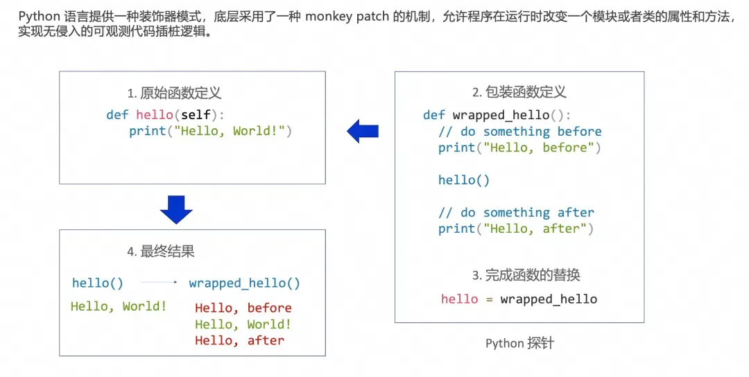 这个 hello 就是原始的方法定义,Python 程序运行的初始化的阶段,可以把原来那个函数的类似于引用给替换掉。实际执行的就是替换后的包装方法。在包装后的方法里面,还会去调原来的那个方法。最后的结果,就像第 4 步看到的,可以实现在原始的方法的前后去插入一些我们想要的一些逻辑。然后通过这种方式,我们就能够实现一个在用户的代码不修改的情况下去采集各种数据。