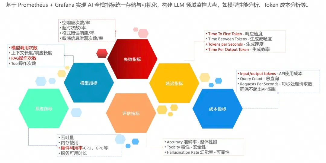 Token 可能是 AI 应用最重要的一个指标,每次请求会记录 Token 的消耗情况,甚至我们需要精确地区分 Input token 和 Output token 的消耗情况,到底为什么呢?因为大家知道模型的定价里面 input token 的 output token 的定价都是不一样的,我们在成本核算的时候,会将输入 token 和输出 token 分别进行统计。还有像系统的利用率,包括 GPU 使用率,模型 KV 缓存的命中率等。在每一个领域,都会有一些比较黄金的指标。