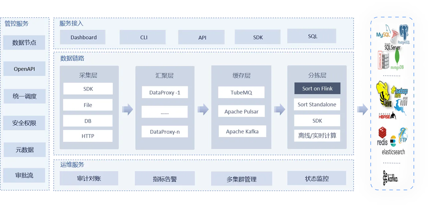 - inlong-sort,对从不同的 MQ 消费到的数据进行 ETL 处理,然后汇聚并写入 Hive、ClickHouse、HBase、Iceberg、Hudi 等存储系统。