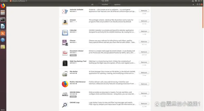 打开软件包管理器。Ubuntu自带了一个GUI(Graphical User Interface,图形化用户界面)软件包管理器,它可 以让你在一个可视化窗口中卸载程序。如果你不习惯使用命令行,这一工具将非常有用。