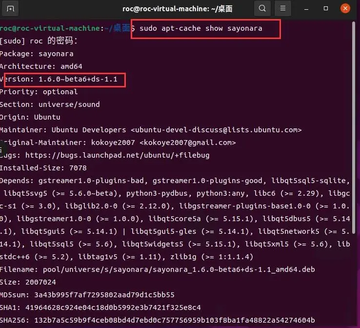 例如,查看sayonara软件包的相关信息,可以使用命令:sudo apt-cache show sayonara