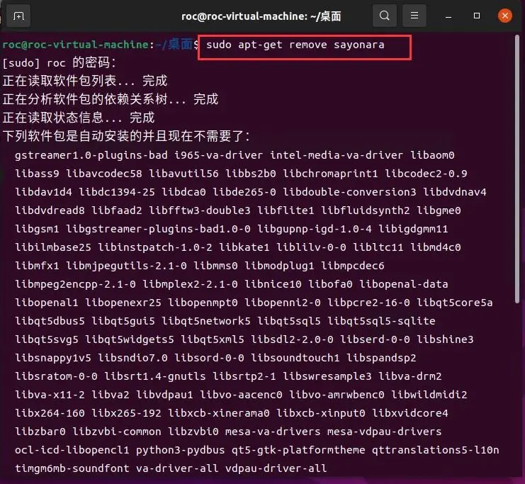 例如,卸载删除软件Sayonara,可以使用下面的命令进行卸载删除操作。