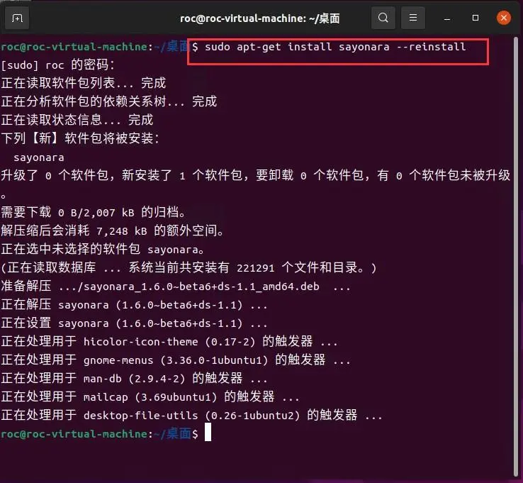 例如,重新安装sayonara软件。可以使用下面的命令: