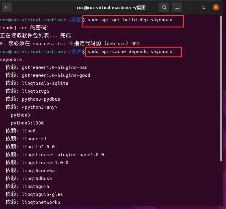 查看该包被哪些包依赖的命令格式:sudo apt-cache rdepends sayonara