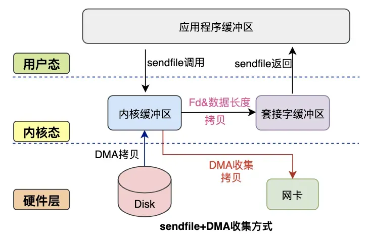 个人感受:sendfile方式只使用一个函数就可以完成之前的read+write 和 mmap+write的功能, 这样就少了2次状态切换,由于数据不经过用户缓冲区,因此该数据无法被修改。
