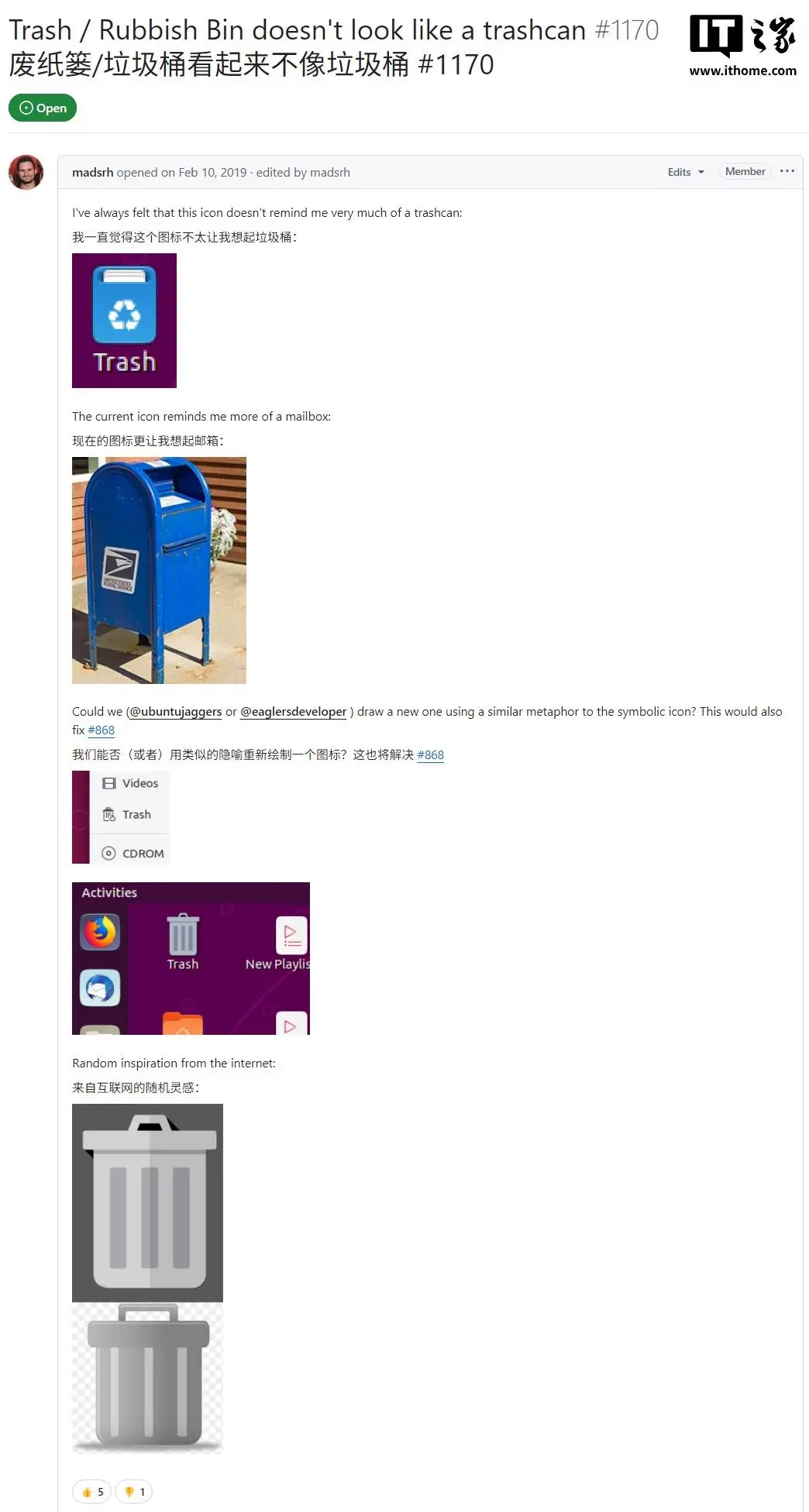 IT之家注意到,这一讨论出现在 Ubuntu 默认主题 Yaru 的 GitHub 项目中。有开发者认为 Ubuntu 系统现有垃圾箱图标的主要批评是,它看起来有点像信箱图标。当垃圾箱中有文件时,出现的纸张看起来相当整齐,像信件一样,增强了它是信箱而不是垃圾箱的印象。