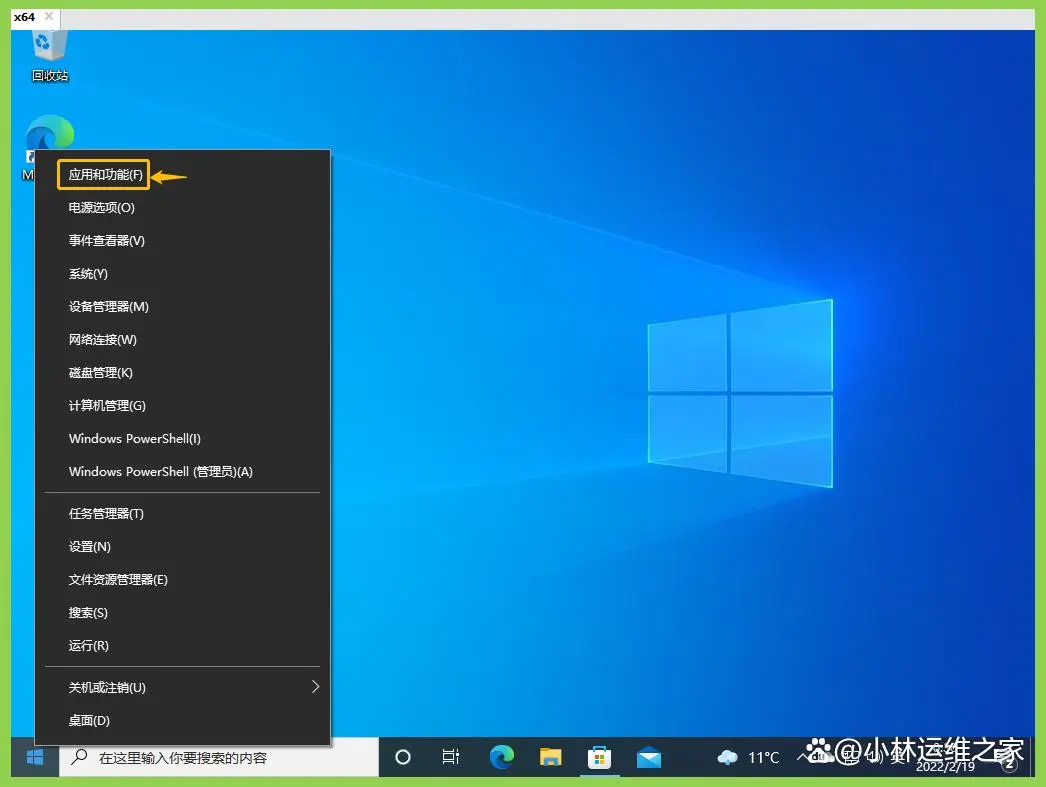 2.5 打开后如果一直连接不上的话就先关闭,回到Win10桌面>将鼠标放在“开始菜单栏处”然后按住右键,找到“应用和功能”选项>点击进入;