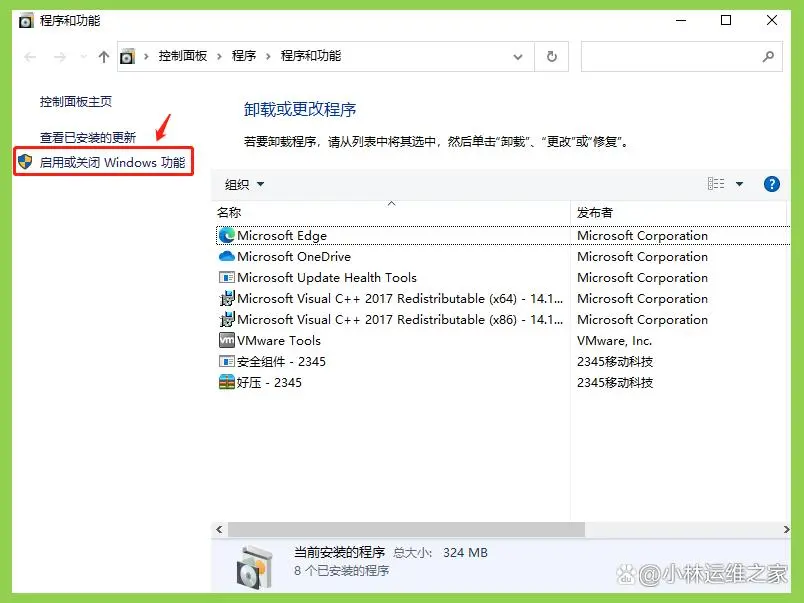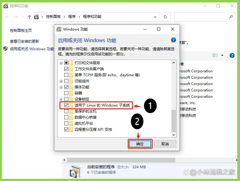 2.7 点击“打开或关闭Windows功能”选项>将“适用于Linux的Windows子系统”此项勾选>保存退出>之后会提示需要重启电脑,重启后即可使用!