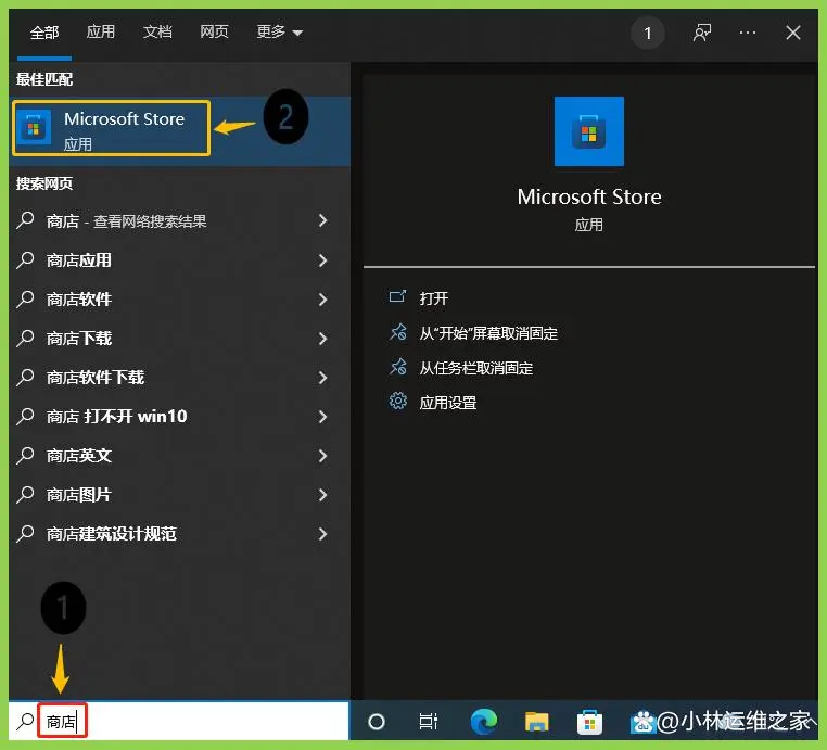 2.1 在Win10菜单栏的搜索框中输入“商店”二字即可找到“Microsoft Store”应用>将其打开;
