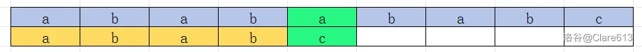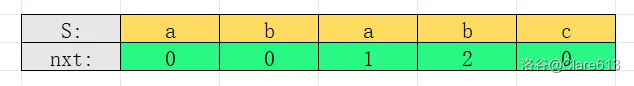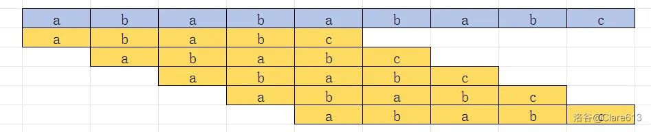 那么怎么处理呢?我们需要用一个 $nxt$ 数组,而我们需要判断的就是,在一个固定的子串中,最长前后缀长度就是可以避免的。\