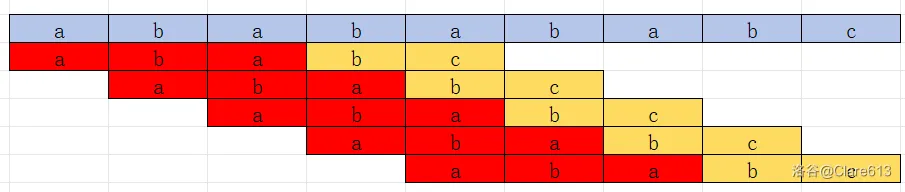 我们可以看到上图标红的区域其实是相同的,而第一次符合的就可以与自己本身所对应的先提前比较,避免浪费时间来处理整个的。\