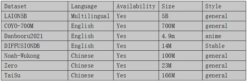 数据的重要性不言而喻,大量高质量的文图数据是文生图发展的血液,没有数据再好的算法也发挥不了作用。数据集不是开源一堆url提供下载就完了,其中包括了水印识别、NSFW(Not Suitable For Work)图片识别、文图匹配过滤等多种预处理操作,甚至包括说明文字的生成、改写和优化等操作。这个方向国外的LAION团队做的非常的扎实,国内也有一些公司开源了数据集。下表2列出,仅供参考。