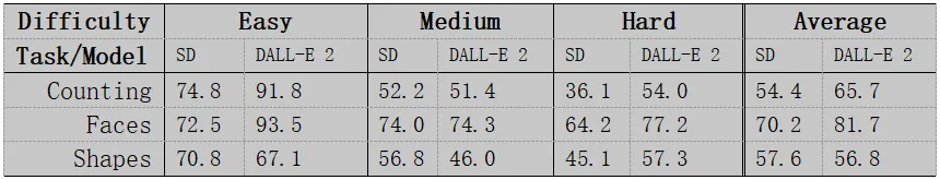 但就像前面提到的一样,机器评价指标好就真的会生成更高质量的图片吗?由此可以看出,人工评价可能是更加合适文生图模型的评价方式。但是人工评价没有统一的标准,成本比较高。文章Human Evaluation of Text-to-Image Models on a Multi-Task Benchmark[5]提出了一套人工评价的标准。让人从三种prompts的难度以及三种不同的task维度来对比不同的文生图模型的图片生成效果(见表1),比如SD和DALL-E 2。难度的定义用论文中的原文表述是:“In that case, the task may be easy: generating 1-3 objects, medium-generating 4-10 objects, and hard-generating more than ten objects.”