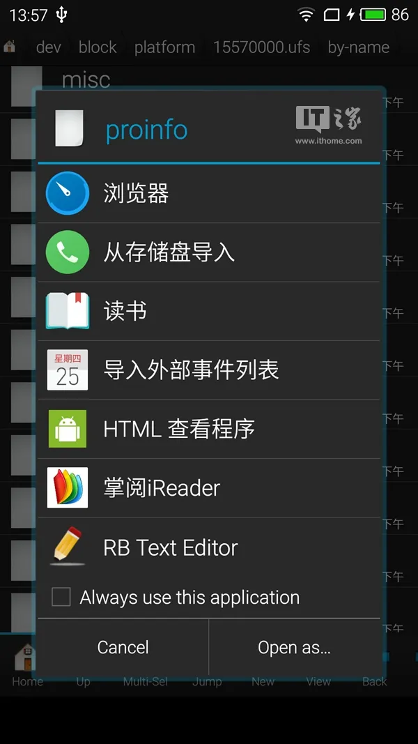 找到文件:proinfo,点击文件,选择“Open as…”,选择“Text file”,再选择“RB Text Editor”。