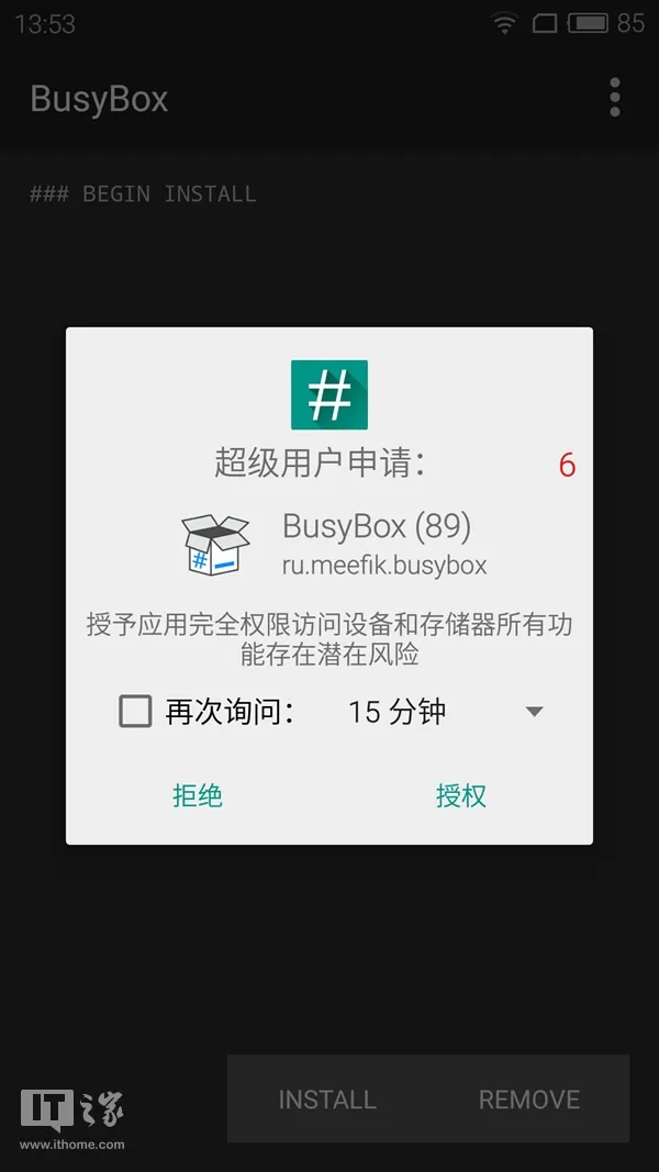 在安装的过程中,Busybox将申请系统的Root权限,请同意申请(此时Root授权将由SuperSU接管)。
