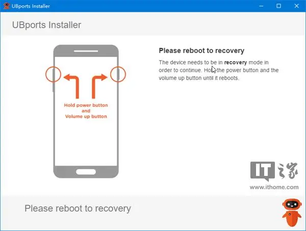 接着刷机工具将为你的手机刷入Ubuntu Recovery,Recovery刷入完成后,请根据刷机工具的提示同时按住音量增加键和电源键,直至手机重启至Recovery模式。
