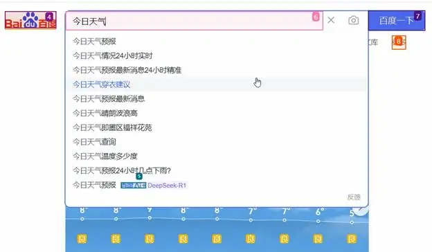 下图就是Browser-Use操作日志。上图很明显对应下图的“Step 2”,智能体评估上一步骤“Success - aly.kenalvey.com”(成功导航到百度)、智能体回顾任务“Need to search for today's weather information.”(需要搜索今天的天气信息。)、智能体规划下一步目标“Input the search query for today's weather and retrieve the information.”(输入今天天气的搜索查询并检索信息。)、具体包括2个规划执行步骤,即“Action 1/2: {"input_text":{"index":12,"text":"今日天气"}}”(在索引标示为12的元素对象执行输入“今日天气”操作)和“Action 2/2: {"click_element":{"index":13}}”(在索引标示为13的元素对象执行单击操作),索引标示为“12”的位置对应关键词输入文本框,而索引标示为“13”的位置对应“百度一下”按钮。Controller(控制器)在实际执行时,输入“今日天气”会出现关键词匹配下拉列表,如图6-19所示。因此日志信息为“Something new appeared after action 1 / 2”(动作1/2后出现新内容)。