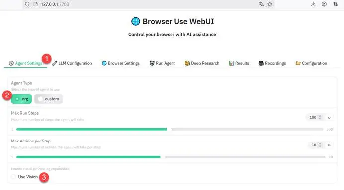 (5) 浏览器输入“http://127.0.0.1:7788”访问本地运行的Web UI。单击“Agent Settings”页,“Agent Type”选择“org”,取消“Use Vision”复选框。“Agent Settings”页设置,如下图所示。