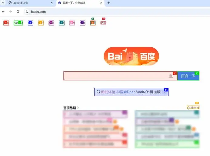 词,搜索今日天气情况。找到今日天气情况后,提取天气相关信息并输出。Browser-Use在执行过程中对操作页面上所有元素进行识别、索引标示,如下图所示,就是Browser-Use执行过程中操作截图。