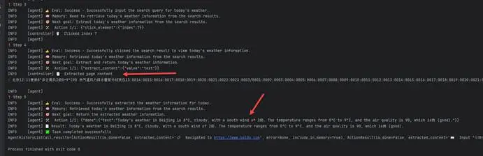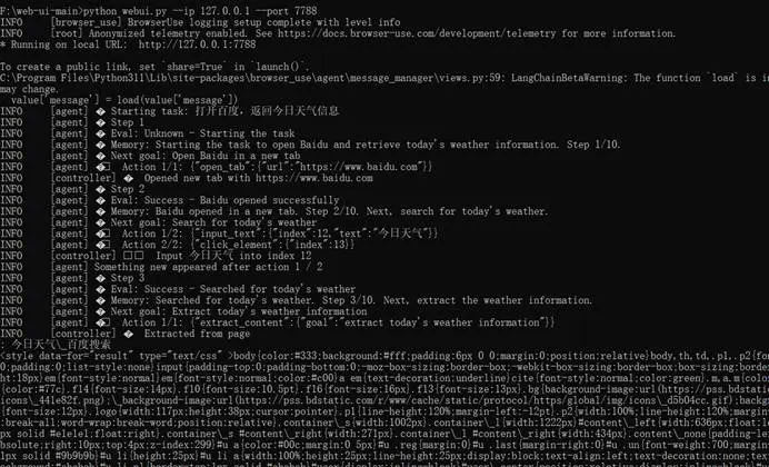 (3) 执行代码。将会看到Browser-Use自动打开浏览器访问百度,输入“今日天气”关键