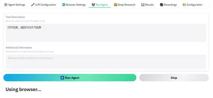 (7) 单击“Run Agent”页,“Task Description”输入“打开百度,返回今日天气信息”,如果在测试一些需要登录的应用时,可以在“Additional Information”添加附加信息,如用户名和密码信息。单击“Run Agent”按钮。“Run Agent”页设置,如下图所示。