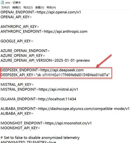 (2) 进入该项目,将“.env.example”文件重命名为“.env”。填“DEEPSEEK_ENDPOINT”