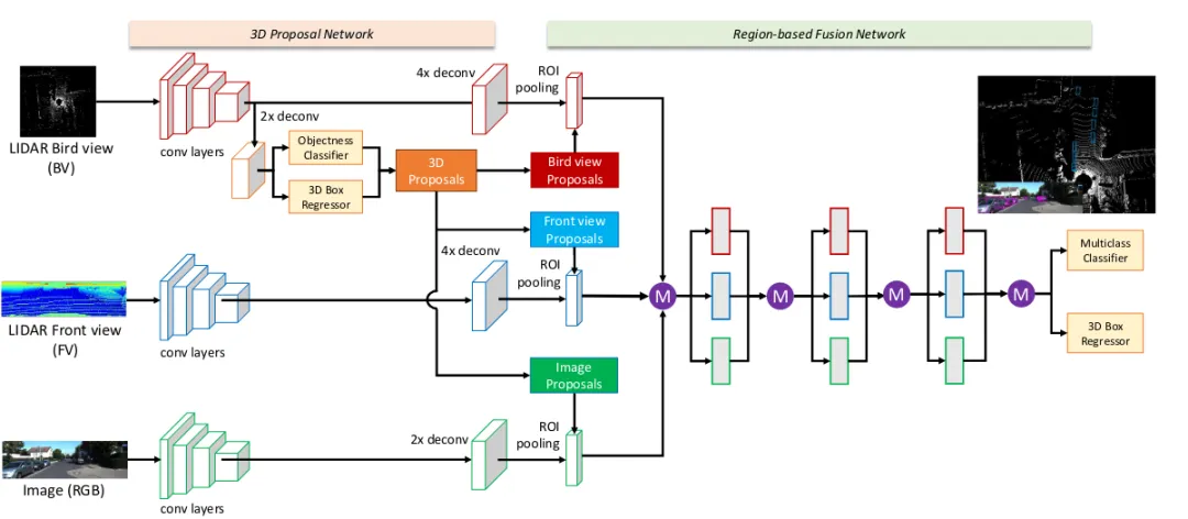 多传感器融合(MV3D)利用了图像、点云俯视图,以及点云平视距离图(Range Image)作为输入,分别对三种视图提取特征,并在俯视图上生成3D Proposal,利用3D Proposal提取对应的其他模态的特征图,最终将三种模态的特征融合,在融合后的特征层预测目标位置。其网络架构如图11所示。