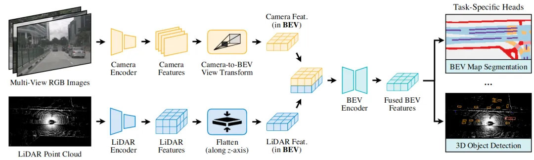 MV3D类方法在特征融合阶段各个模态的维度不尽相同,如图像特征为二维特征,而点云特征为三维,使得特征融合较为困难。近年来,基于BEV视图的融合方案逐渐流行,其基本思想是将各个模态的特征转换到BEV空间进行融合,BEV融合方法在多传感器融合方面占据了主导地位。目前依据网络架构不同,BEV融合方法主要可分为两类,一类是基于DETR-based方法,代表工作如FUTR3D等,图12展示了FUTR3D的网路架构;另一类是BEV-based方法如BEVFusio等,图13给出了BEVFusion的网络架构。
