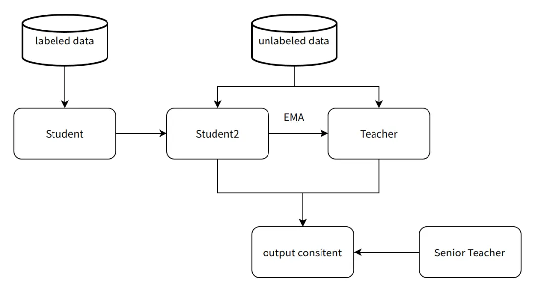 - 第一步,我们标注少量的数据,并用该少量标注数据训练Student网络和Senior Teacher网络。