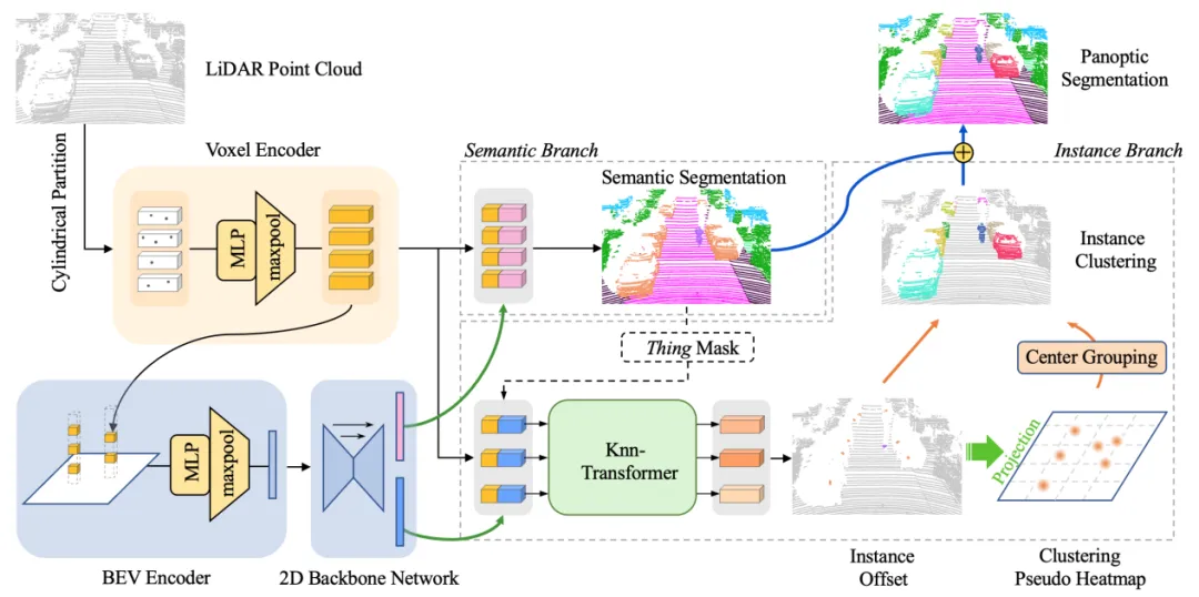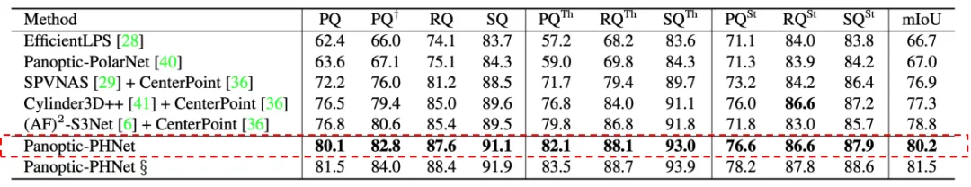 以往基于点云的实例分割任务主要分为proposal-base和proposal-free方法。proposal-based方法依赖于目标检测器的性能,而proposal-free的方法因为采用启发式的聚类方法,耗时比较高。因此,我们提出了一种新颖的Panoptic-PHNet点云全景分割网络,该网络预测实例的中心点,而无需object-level任务的学习,其网络架构如图22所示。该工作在nuScenes的全景分割挑战赛取得第一名的成绩,论文入选CVPR 2022。在取得高精度的同时,该网络推理速度达到数十FPS,满足了实时性的要求,图23给出了该网络与其他公开方法的对比结果。
