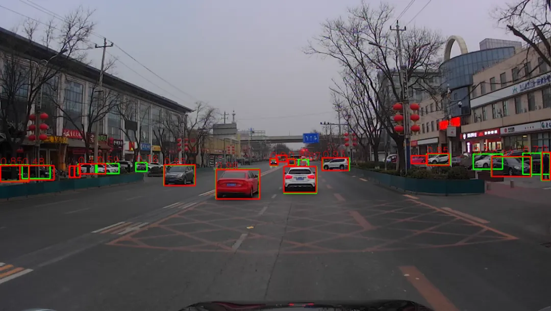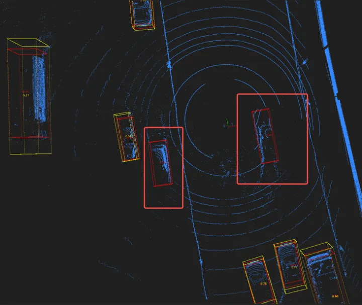 经过量化评估发现,在引入极端天气数据增强后,模型在极端天气数据上提升非常明显。如图33所示,在雨天数据上,引入数据增强后模型可正确检测出目标(红色框),而未引入数据增强模型则发生漏检(黄色框)。