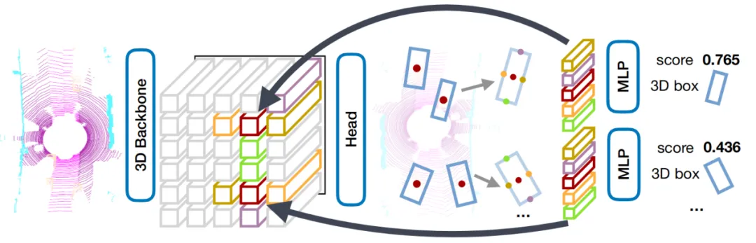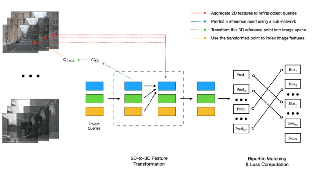 如DETR3D(网络架构如图7所示),由一群可学习的3D空间中离散的位置(包含于object queries),根据相机内外参转换投影到图片上,来索引图像特征,每个3D位置仅对应一个像素坐标(会提取不同尺度特征图的特征)。