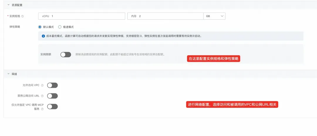 随后,你可以按需选择此 MCP 服务需要的资源配置和网络配置。资源配置决定了你的服务是否需要开启极速模式预留实例快照以及此服务需要的 CPU 和内存规格。网络配置决定了你的 MCP 服务是否要绑定 VPC 进行内网访问以及是否禁用公网 URL。