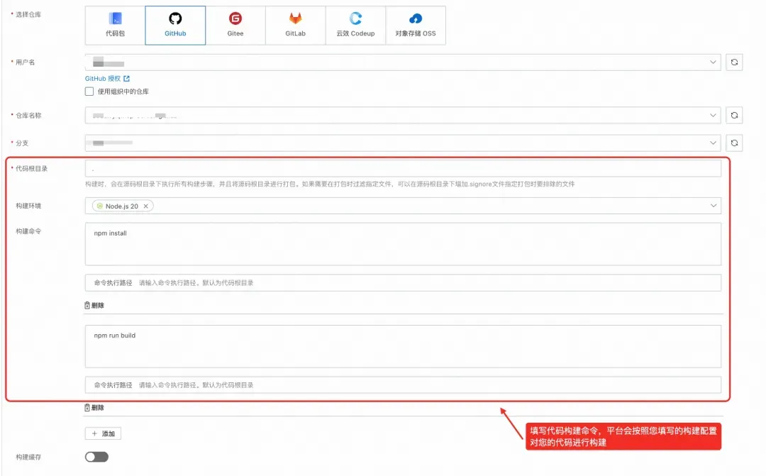 - 代码首选需要通过 npm install 安装相关依赖,随后执行 npm run build 编译相关源码,在构建命令中填写相应命令,命令执行路径不填,默认会使用代码根目录,即在代码仓库的根目录下执行此条命令;