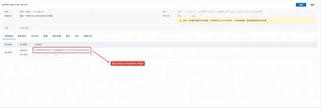 部署成功后,你可以点击“访问地址”查看公网访问地址和私网访问地址,你可以根据此地址,将此 MCP 服务注册到百炼等第三方模型服务提供平台,提供给大模型进行调用。
