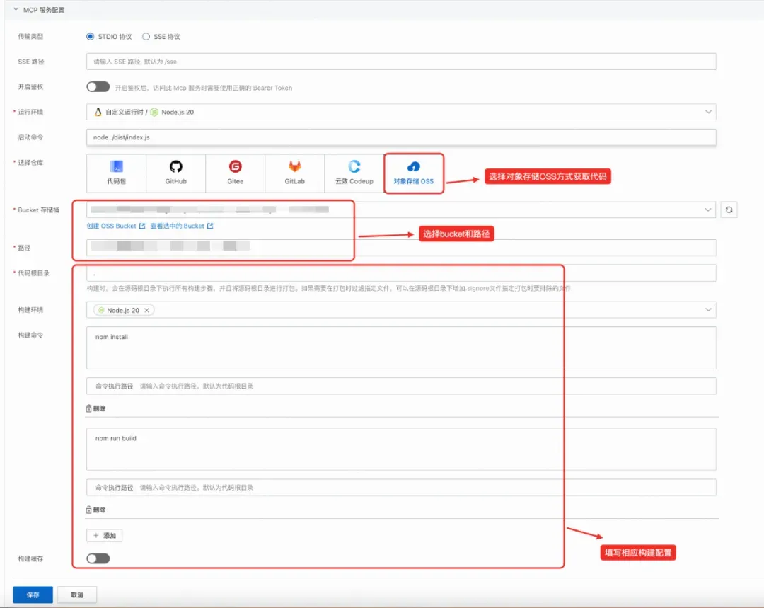 新建 MCP 服务,点击 OSS 上传,你可以选择你当前账号下的 Bucket 和 Object 目录,如果上传的 Object 为 ZIP 压缩文件,平台会自动帮你解压缩,在代码根目录下执行构建命令,同样填写运行配置、资源配置和网络配置后(步骤与第一节相同),点击部署,便可将你的代码部署至 Function AI 平台。