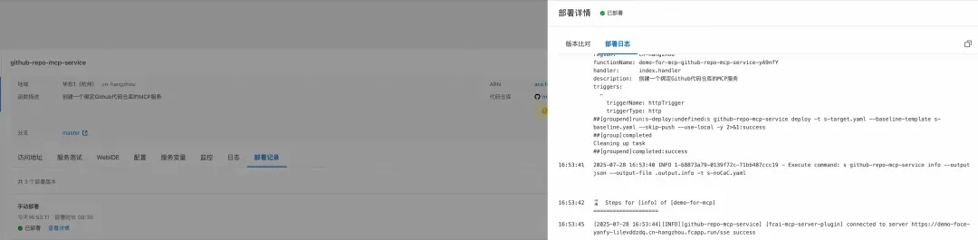 在配置好以上信息后,点击部署服务,即可将服务构建并部署至 Function AI 平台上。你可以点击部署记录查看构建和部署日志(包含安装代码依赖、部署程序至函数计算服务中)。