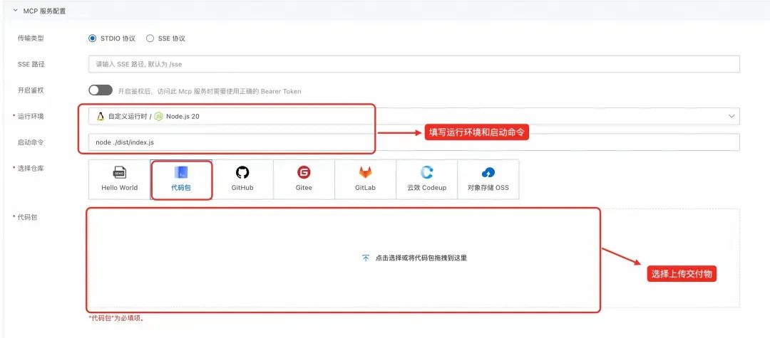- 示例中的 MCP 服务是基于 Nodejs 进行开发的,因此选择了 Node.js20 作为构建环境;