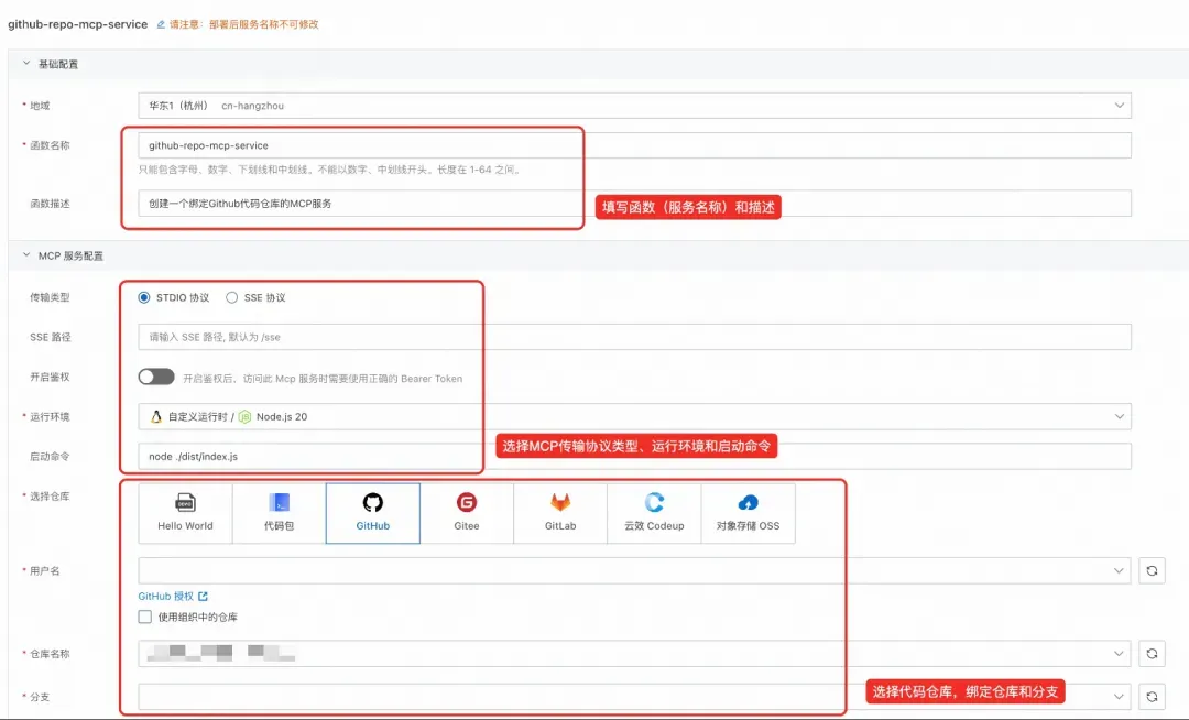 进入基础配置,可以定义你的 MCP 服务(函数)名称和描述。进入下面的 MCP 服务配置,选择你想绑定的代码仓库(Github、Gitee、Gitlab 或 Codeup)。点击“授权”,跳转到代码仓库的页面,将你的账号授权给平台,获取你的仓库和分支信息。授权完毕后,选择你想绑定的代码仓库和分支。