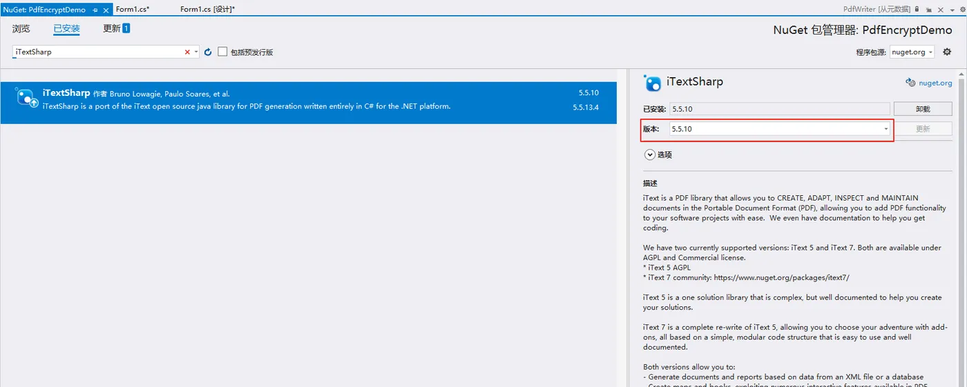 首先打开Visual Studio 2019 创建一个WinForm窗体程序项目。然后引入第三方iTextSharp类库版本5.5.10。这里直接使用nuget包直接安装。