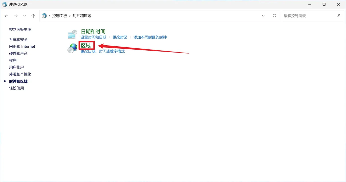 1️⃣ 打开「控制面板」 → 选择 “时钟和区域
