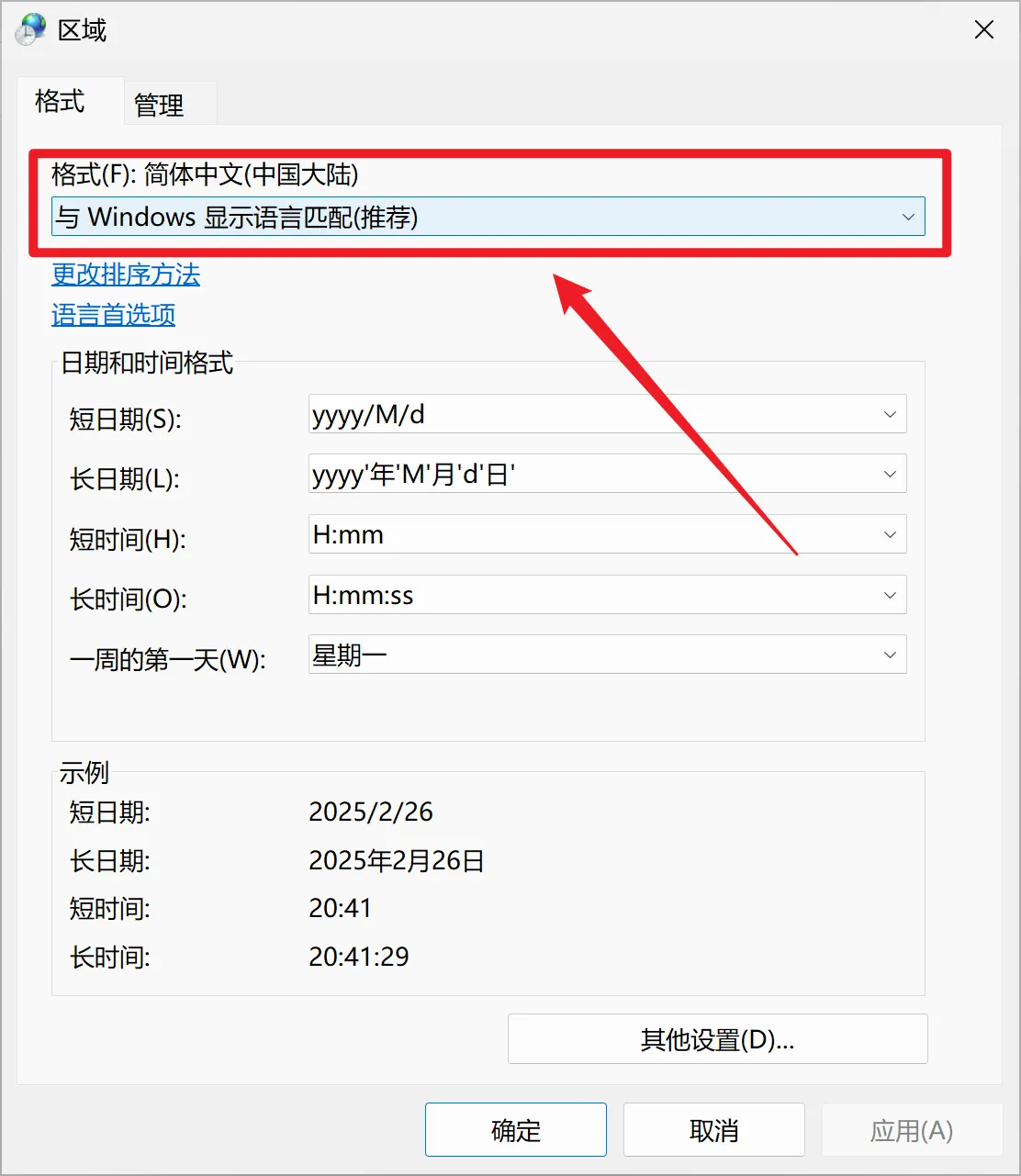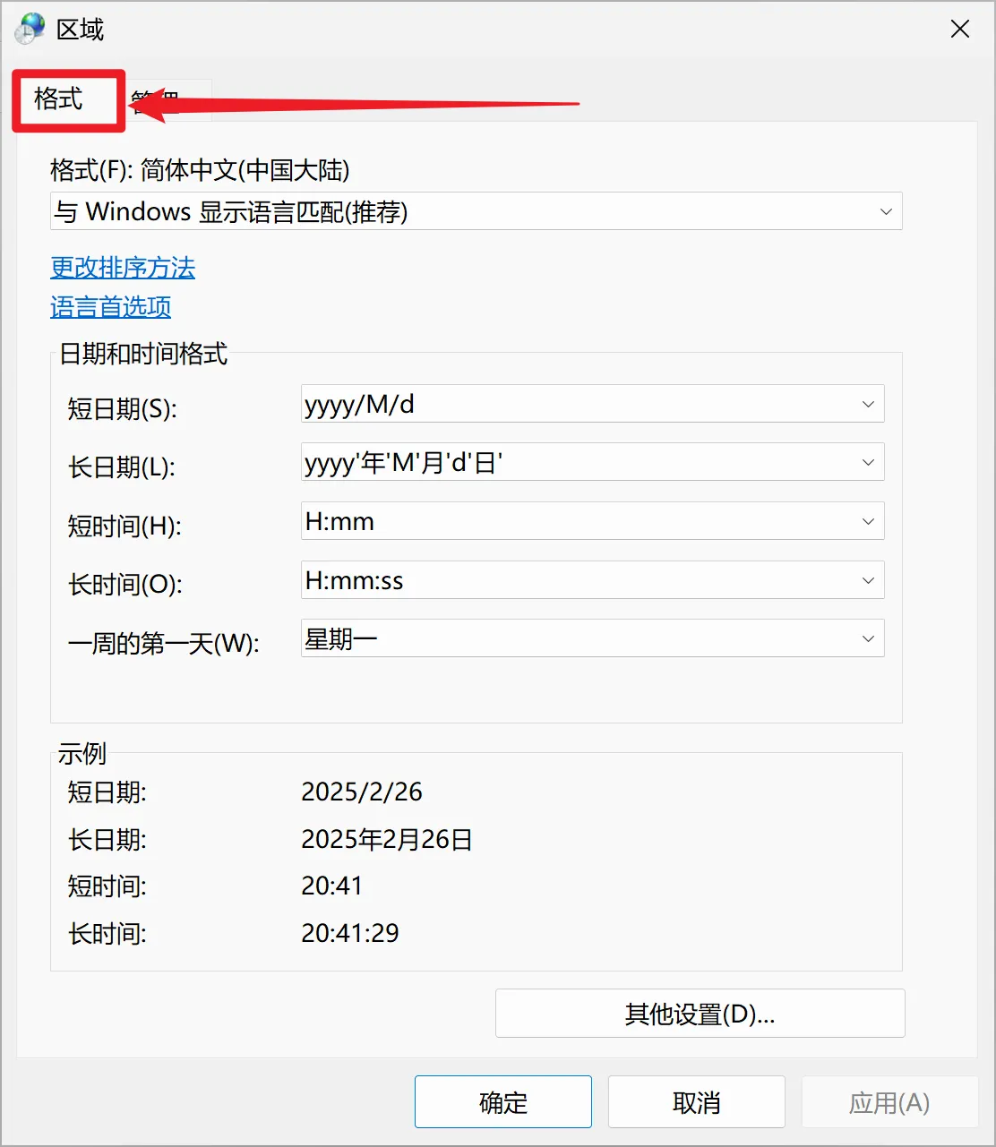 2️⃣ 进入「区域」 → 切换到“格式”选项卡,修改为 “中文(简体,中国)”