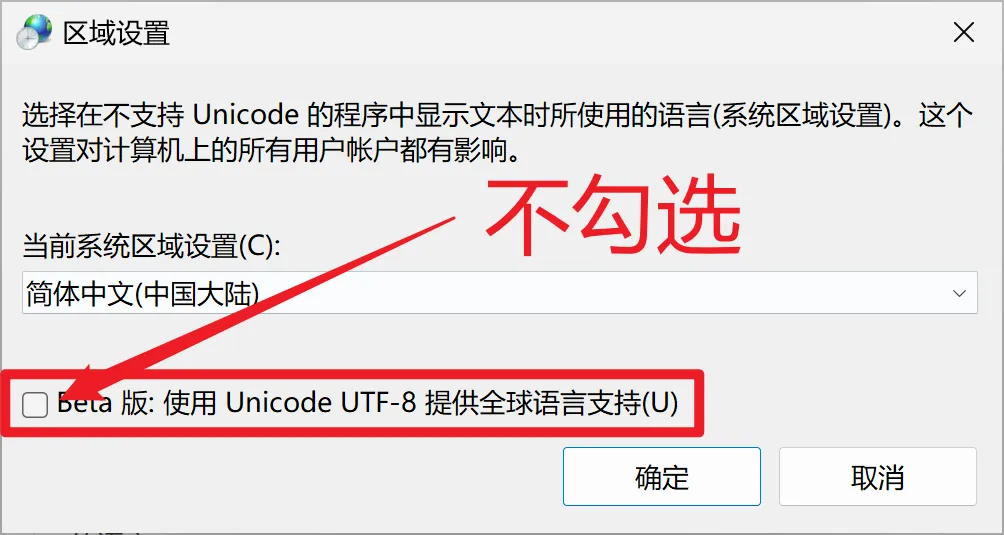 4️⃣ 确保“Beta 版: 使用 Unicode UTF-8 提供全球语言支持” 未勾选,如果有就这样操作,没有就不用管