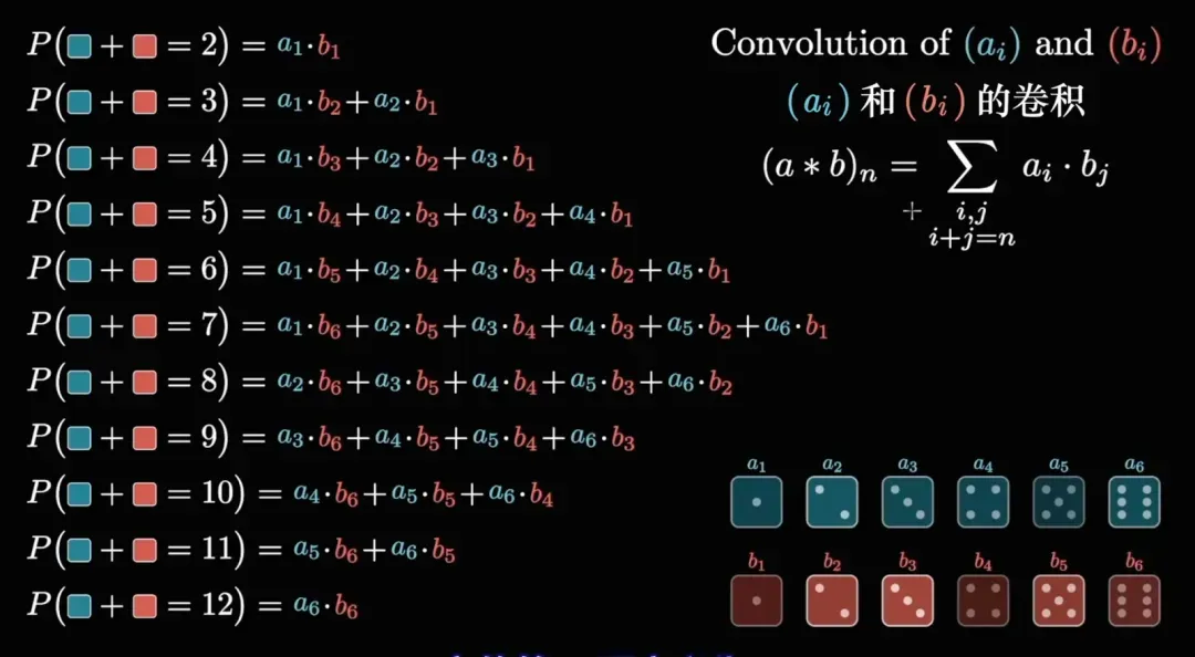- 两个独立随机变量的和的概率分布,是它们各自概率分布的卷积。因此两个骰子的点数和的概率分布可以通过对单个骰子的概率分布进行卷积得到。