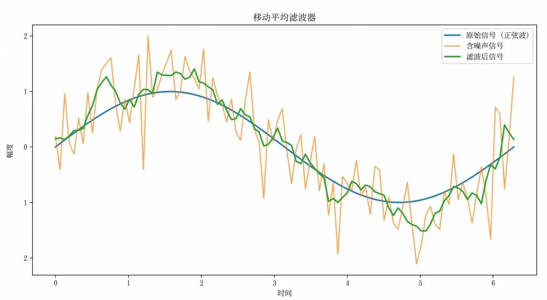 import numpy as np import matplotlib.pyplot as plt # 生成原始信号(一个简单的正弦波加噪声) x = np.linspace(0, 2 * np.pi, 100) original_signal = np.sin(x) noise = np.random.normal(0, 0.5, original_signal.shape) noisy_signal = original_signal + noise # 一个长度为 5 的平均滤波器 filter_size = 5 filter_kernel = np.ones(filter_size) / filter_size # 对信号进行卷积 filtered_signal = np.convolve(noisy_signal, filter_kernel, mode='same') # 保持信号长度不变 # 绘制信号对比图 plt.figure(figsize=(12, 6)) plt.rcParams['font.family'] = 'SimSong' # 设置中文字体 plt.plot(x, original_signal, label='原始信号 (正弦波)', linewidth=2) plt.plot(x, noisy_signal, label='含噪声信号', alpha=0.7) plt.plot(x, filtered_signal, label='滤波后信号', linewidth=2) plt.xlabel('时间') plt.ylabel('幅度') plt.title('移动平均滤波器') plt.legend() plt.show()